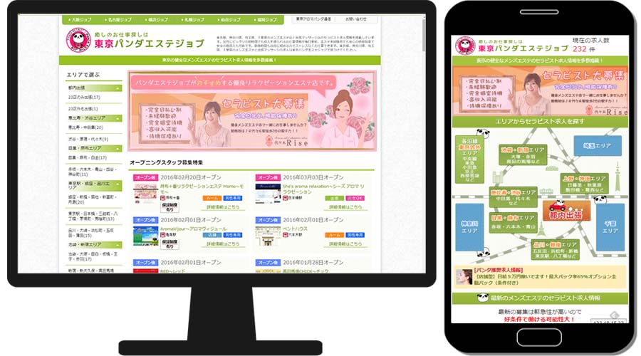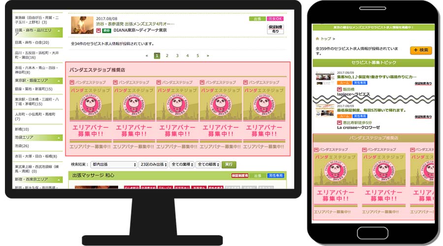 風俗店 アダルト店 出合い系 チャット系 求人ポータルサイト その他弊社運営サイトと競合するポータルサイト その他パンダエステジョブにふさわしくないと判断した広告 アドネットワーク広告 上記は掲載不可となります。