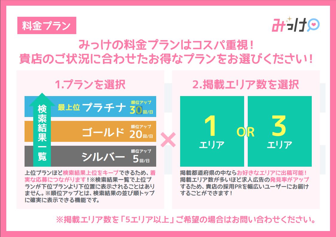 風俗で働きたいけど、どんなお店が良いか全くわからない...そんな悩みを抱えた女性の味方!風俗求人GirlsJob『みっけ』♪ みっけは、風俗未経験・初心者をターゲットにした女性のための求人情報サイトで日本全国の風俗求人を多数掲載しています! 業界内でも比較的リーズナブルな掲載料金も特徴で、働く女性に向けた様々なコンテンツが満載の為、より良い女性とのマッチング率も高精度です。 ただ掲載しているだけでは難しい業界の掲載ですが、みっけの取材コンテンツでは豊富な写真と情報で店舗様の魅力を存分に女性へ伝えることができ、取材記事による応募効果も期待大...!? そんな取材記事が無料で利用可能なキャンペーンも開催中! 狙っているターゲット層から、見事に応募をいただきましょう!